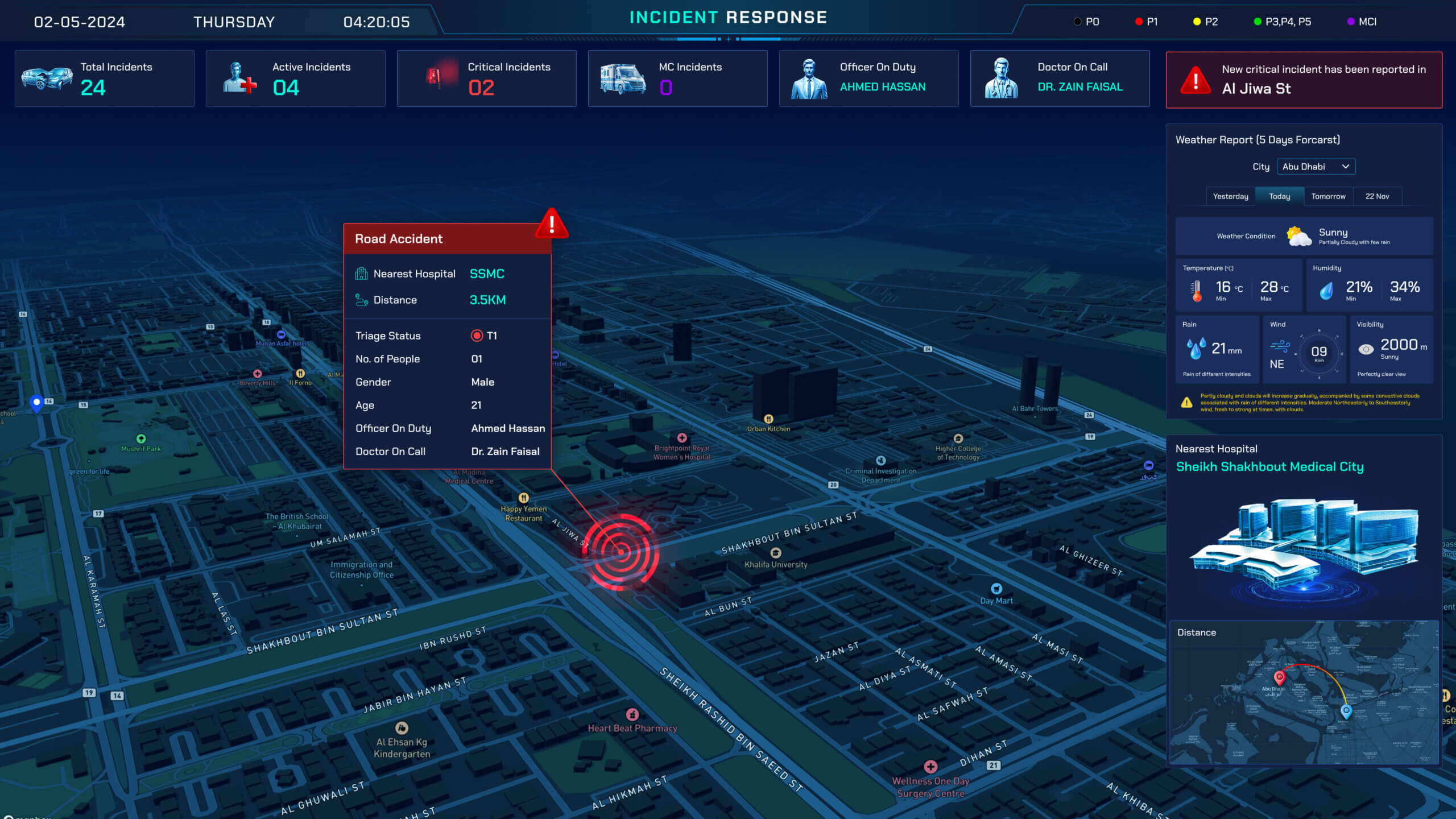 The Aldar Command Center leverages advanced web technologies to deliver a highly interactive, real-time monitoring platform. The Incident Response module uses Mapbox 3D maps to visualize accidents and emergency events across Abu Dhabi, providing live updates and geospatial context. Hospitals are represented with detailed 3D building models, enhanced with animated overlays that reflect operational status, department activity, and resource availability. Additional animations highlight changes in patient flow, bed occupancy, and emergency department activity, creating a dynamic and intuitive visualization for senior leadership. This combination of real-time data, 3D visualization, and animation ensures critical insights are immediately accessible and actionable on the LED wall display.