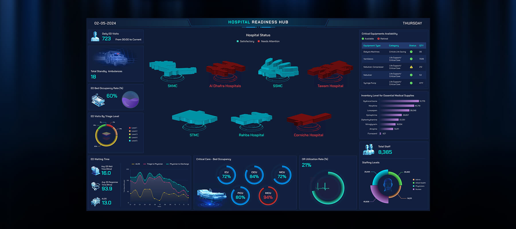 Designed for senior leadership and emergency response teams, the platform enables fast, informed decision-making through five integrated modules: Hospital Overview, Readiness Hub, Resource Management, Emergency Department Data, and Incident Response. By combining live data, predictive insights, and immersive geospatial visualization into a single interface, the command center enhances operational efficiency, coordination, and national emergency preparedness in high-pressure environments.